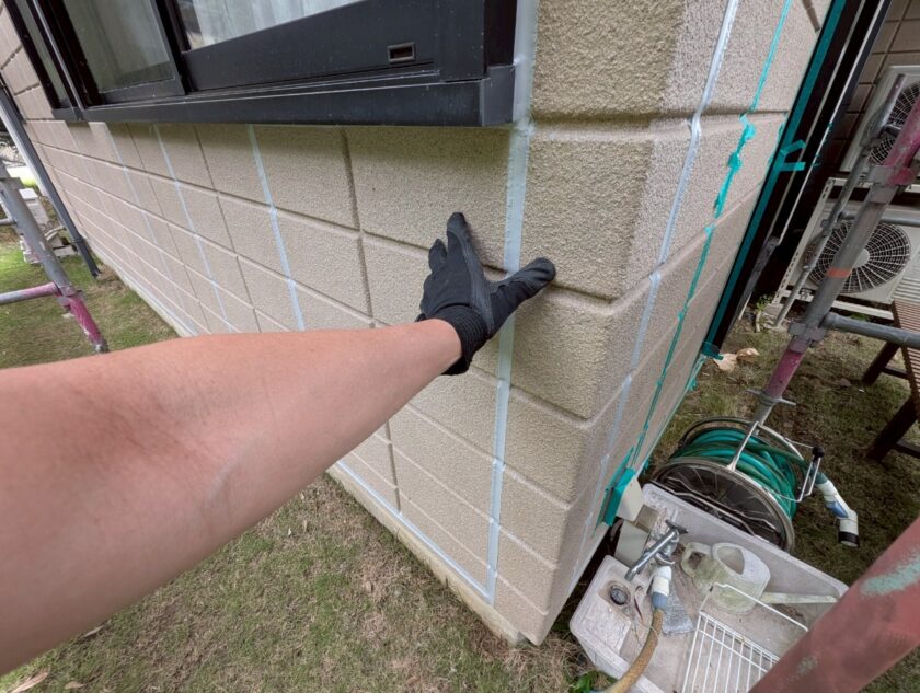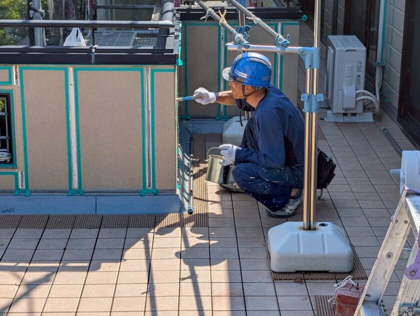 既存目地のシーリングを撤去後、マスキングテープを張り、その後プライマーを塗っていきます。