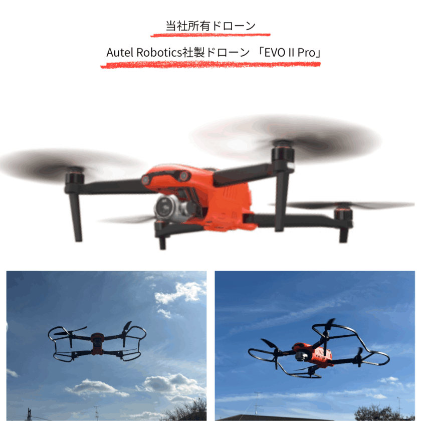 当社が使用しているのはアメリカ製の最新ドローンで普及率の高い中国製のドローンに比べて飛行時間の長さや安定性、安全性に優れ高画質な写真を撮影することができます。
