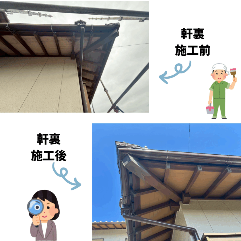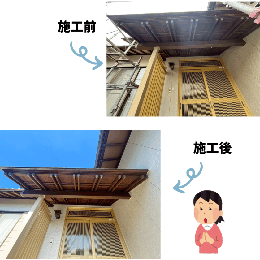 今回施工させていただいたのは和風の軒裏が素敵な戸建て住宅です。和風の軒は意匠性が高く、とてもカッコいいのですが手間がかかってしまいます。ですが経年変化した姿から塗装が完了した姿は見栄えのする素敵な仕上がりとなりました!!
