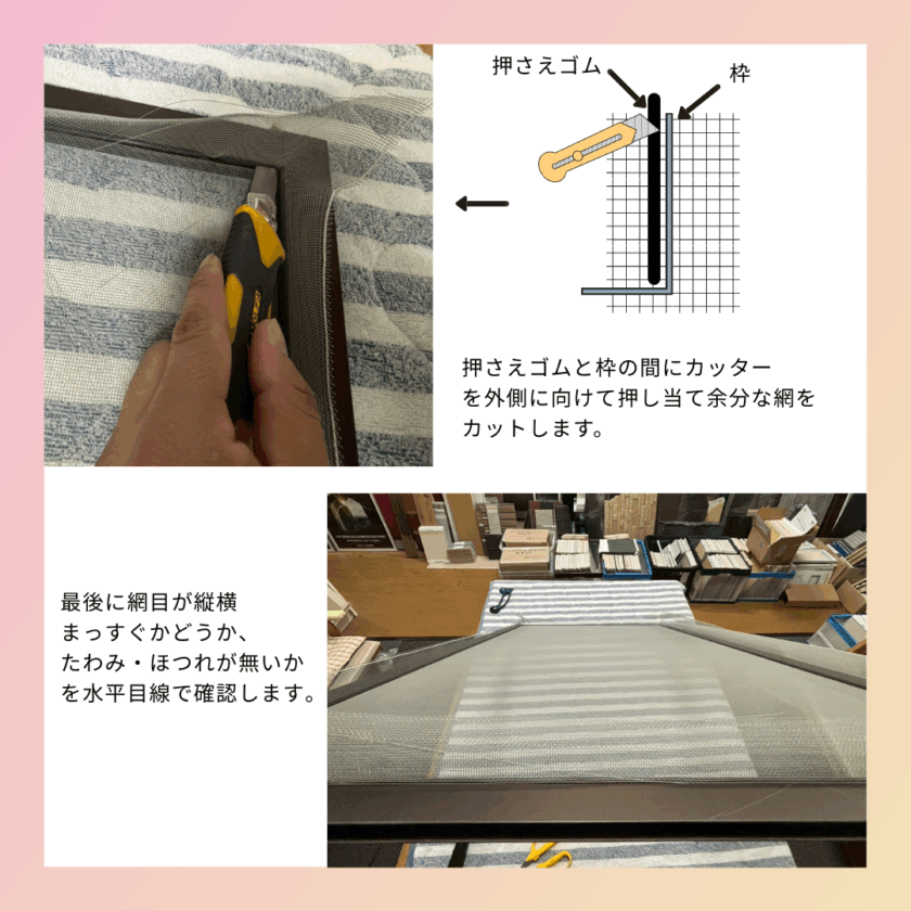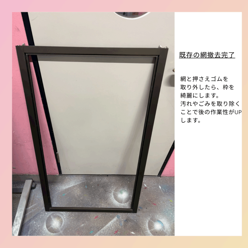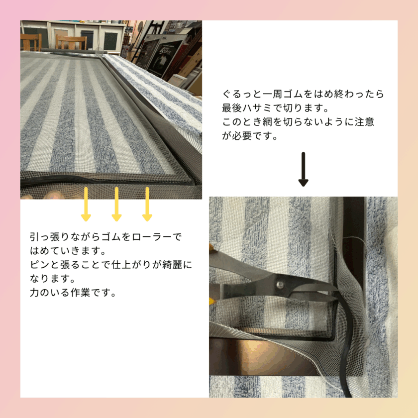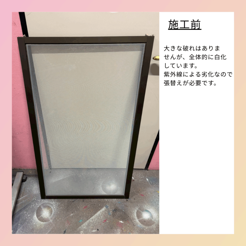 私はコトブキ外装サービスに入社する前少しサッシ屋に勤めていて網戸の張替えができるので、数枚程度なら対応することがあります。