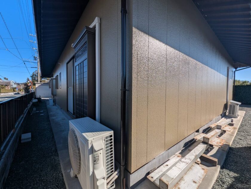 AGC製の超高耐久水性フッ素樹脂塗料「 水性サンバリアSR上塗りGT防藻 」は適度な艶感のある素晴らしい仕上りなります。落ち着きがあり和風住宅にはとても相性抜群の塗料だと思います。お勧めです‼