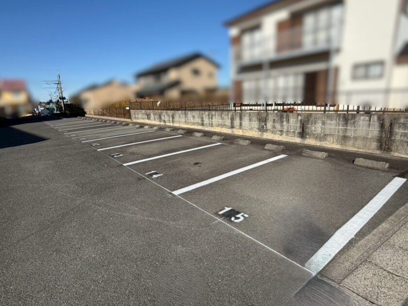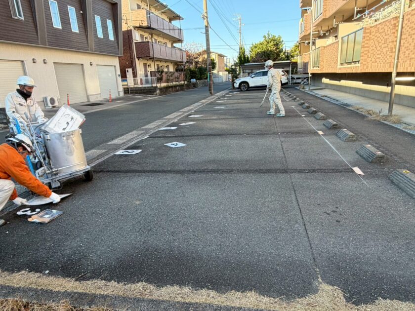 車が無い状態での作業になる為、46区画の駐車場を区画線とナンバリングを行うのは入居者様のご協力がないと施工できません。
