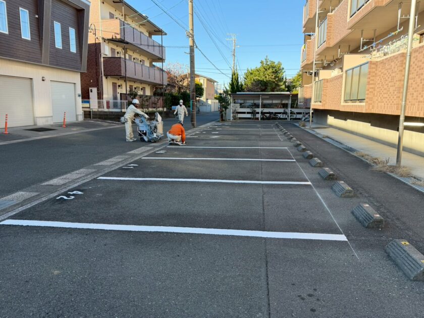 賃貸マンション駐車場が43区画もあると、3~4台くらい駐車されたままで白線工事がその個所だけ出来ない事が多々あるそうです。