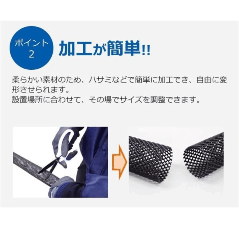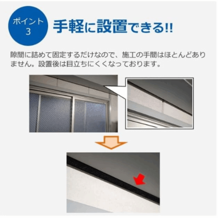 形を整えて隙間に押し込むだけなので簡単に設置可能です。長さもハサミで加工しやすいのでぴったりはめることができます。