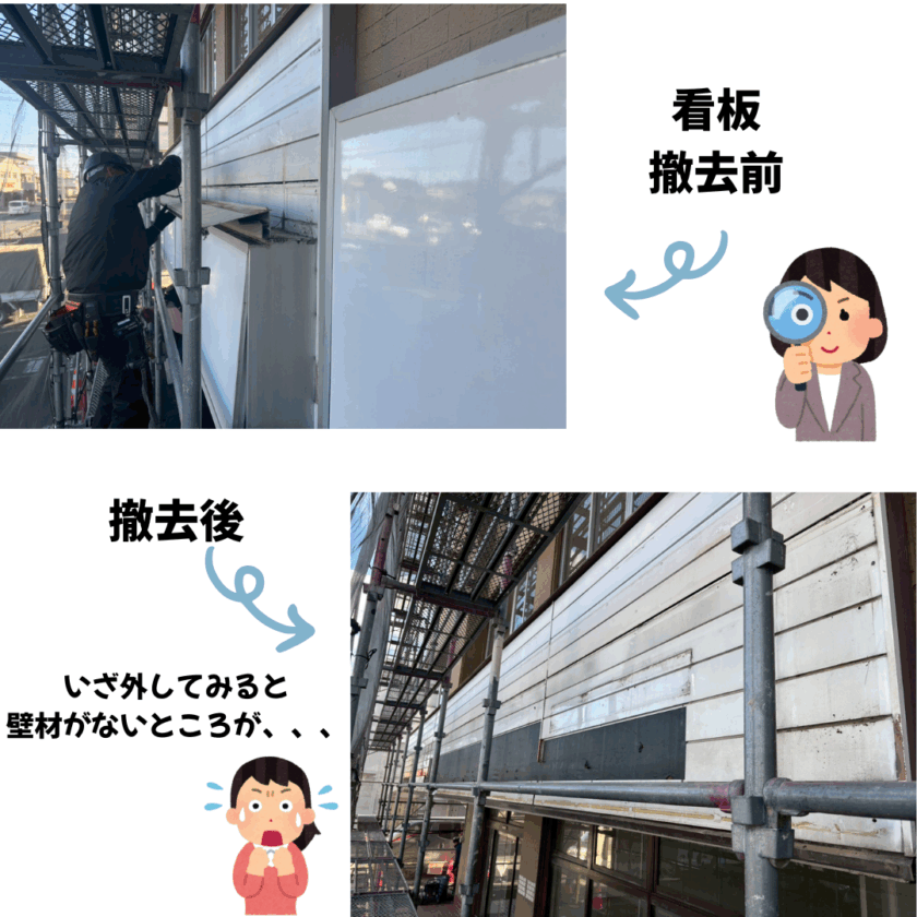先日よりスタートしています、初生町にあるビルの改修工事に伴って塗装工事前の準備として既存看板の撤去作業を行いました。