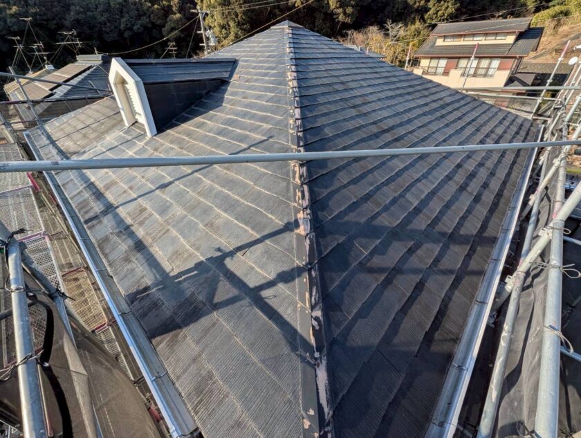 19年の月日が経過したAGC製フッ素樹脂で塗装施工した屋根です。コケカビの発生はありますが、まだ塗膜が残っている箇所も多かったです。そのお陰でスレート瓦の保護が出来ており大きな反りや破損もほぼ見受けられませんでした。