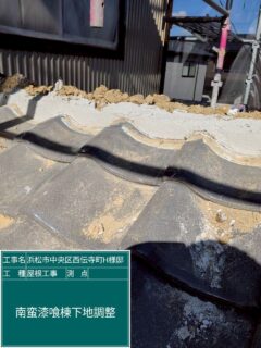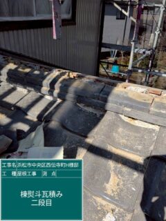 以前、突風で飛ばされた棟瓦ですが内側に向いて葺いてあったので外側に向けてのし瓦を積み直しました。