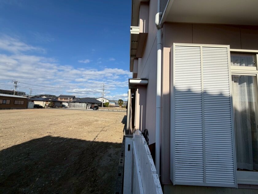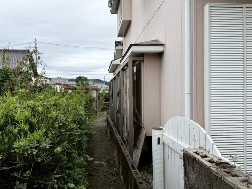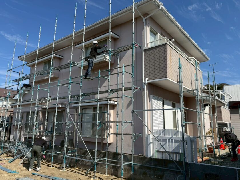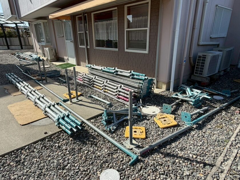 更地になった隣地所有者様にご協力いただき、足場を組ませていただきました。