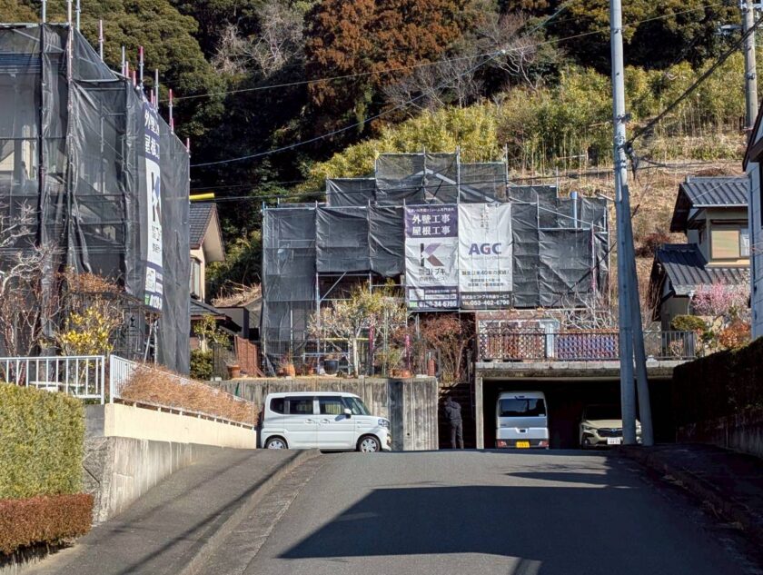 お向かいのS様と同時に外装施工が進行中です!M様どうぞよろしくお願いいたします。
