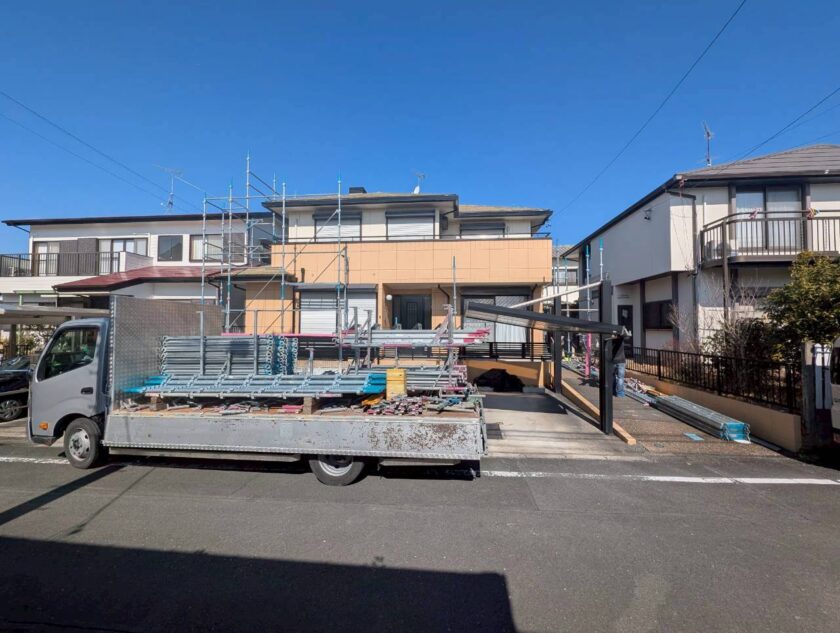 工事の紹介です。最初の工程は足場の設置工事です。