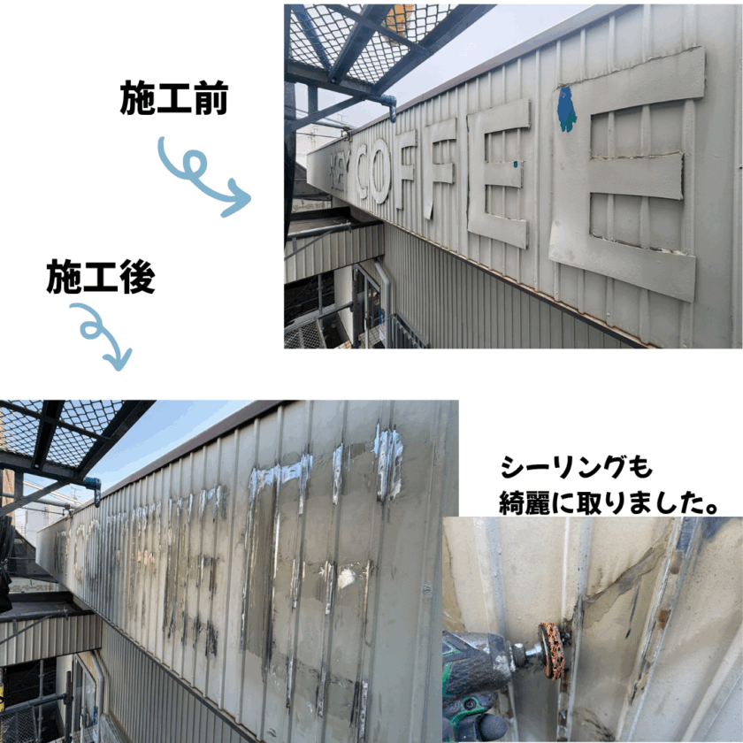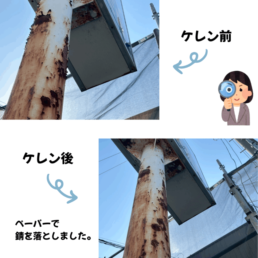 先日足場の設置が終わり工事がスタートしましたので塗装前の準備として文字看板の撤去と柱のケレン作業を行いました。