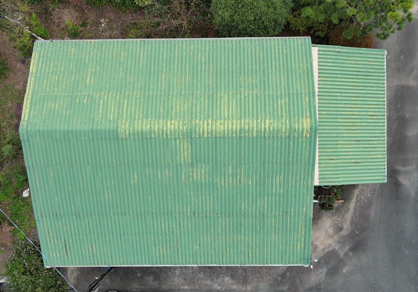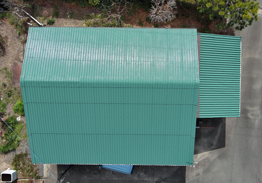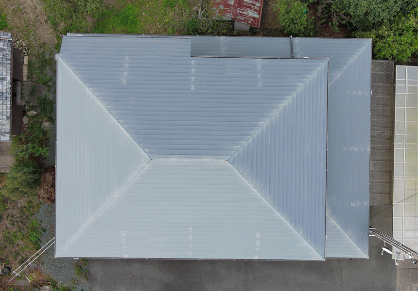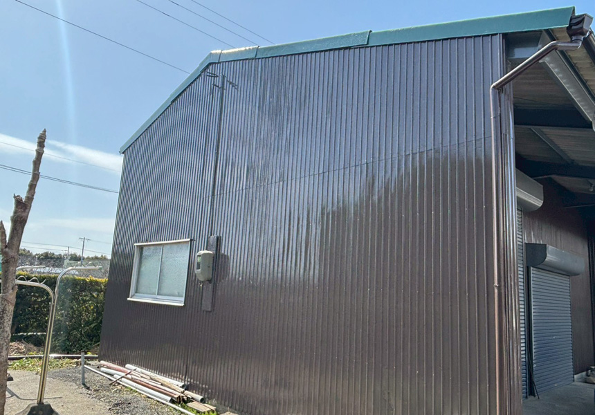 塗料は母屋と離れの倉庫ともに高品質で実績のある日本ペイントの商品を使用しました。母屋にはハイグレードの「グランセラシリーズ」を使用し、離れには安定と実績の「ファインSi」と「ファインルーフ」を使用しました。年々厳しさを増す太陽光の光(紫外線)や雨(酸性雨)、風などのさまざまな環境から建物を守ってくれると思います。