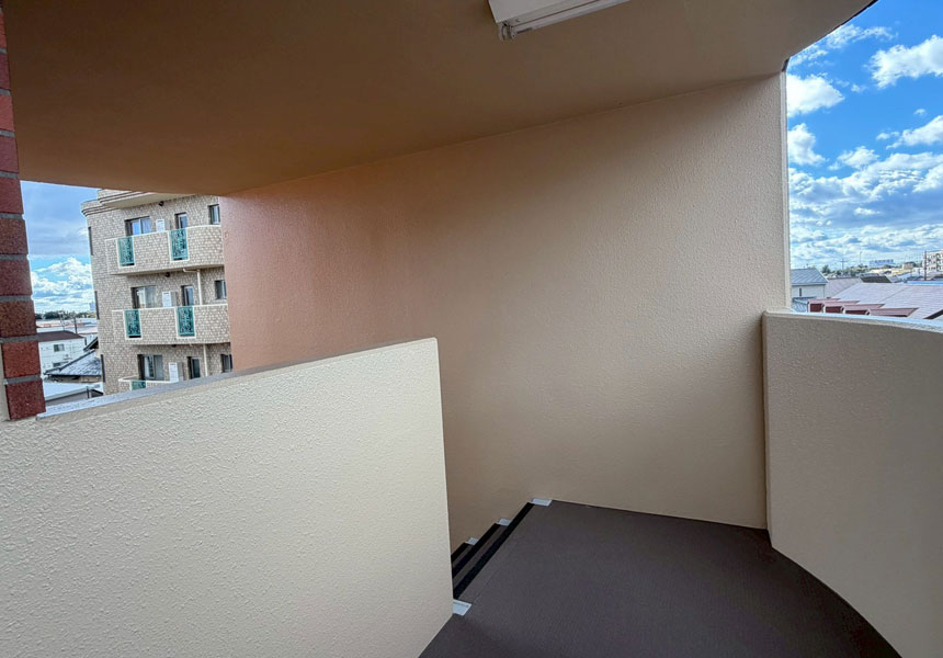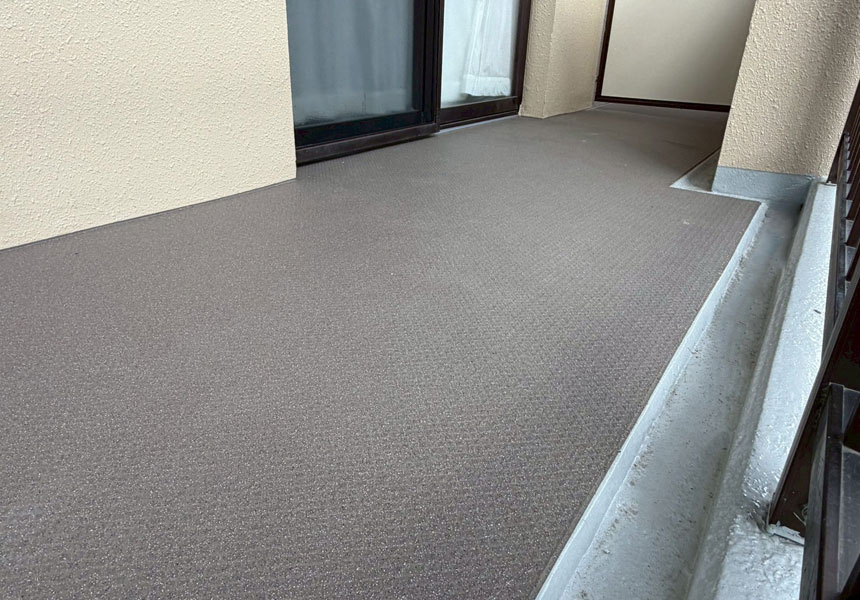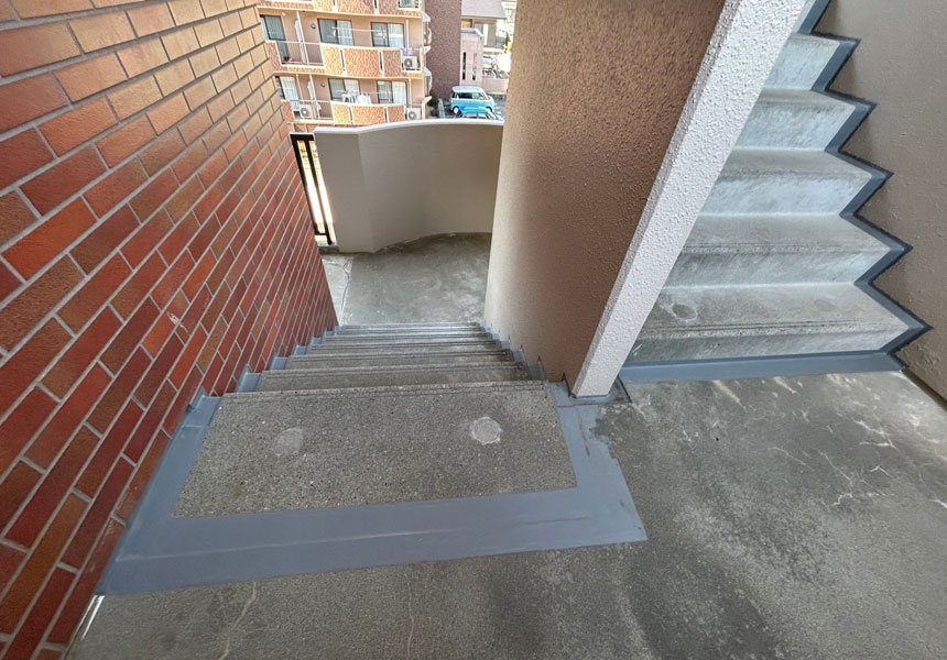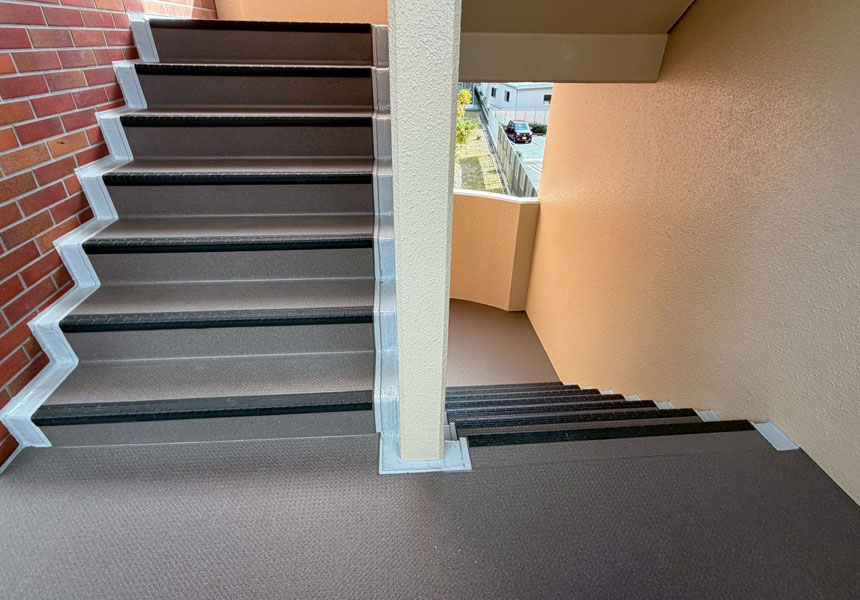 タイル張りマンションです。外壁塗装は20年という長期美観を保つ「AGCルミステージサンバリア」で塗装し、屋上はウレタン防水のTOPコートを、外壁目地等シーリングにて防水工事、階段通路・ベランダ床は「タジマ ビュージスタシリーズ」で防滑シートを施工させていただきました。