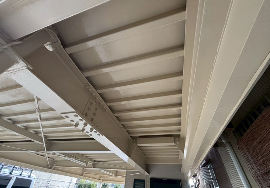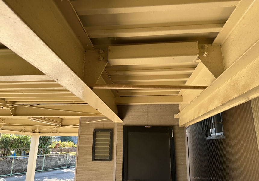 屋根は折板屋根で錆や退色などが著しかったためしっかりと下処理をして塗装しました。1階の鉄骨部分もしっかりケレン作業をして錆止めを入れてから塗装しました。