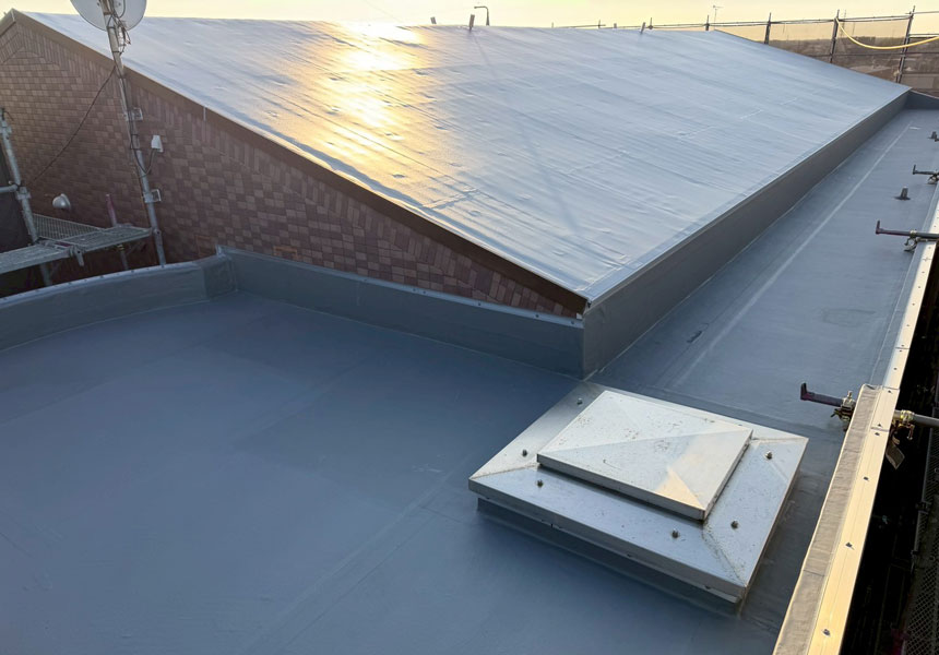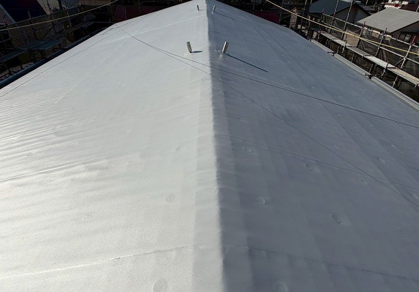 屋上は、アスファルトシングル葺きから塩ビシート通気緩衝工法で、外壁は膨れ剥離の除去後スーパーファインコートシリコン(菊水化学)にて塗装させていただきました。