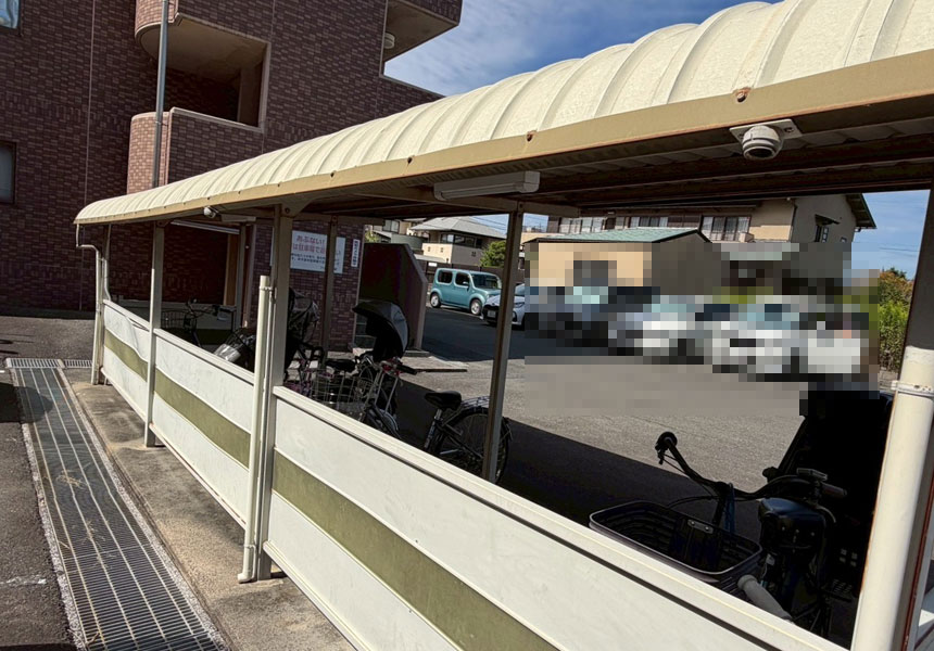 タイル面は打診検査後、緊急性がある箇所のみ補修させていただきました。駐輪場雨樋も補修させていただきました。