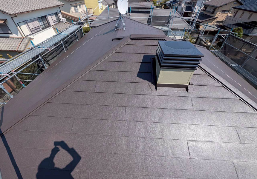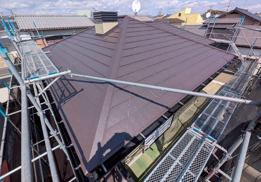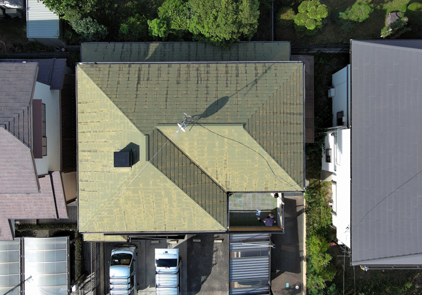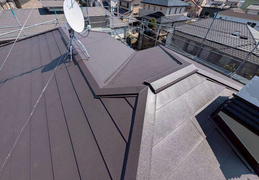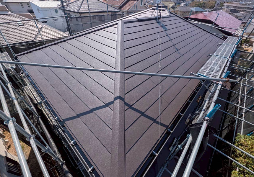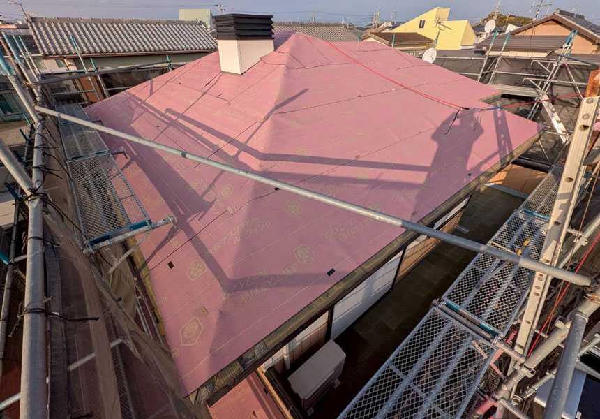 屋根はカラーベスト屋根の上にアスファルトルーフィングを葺き、その上にアイジー工業製の「スーパーガルテクト」のカバー工法を採用いたしました。