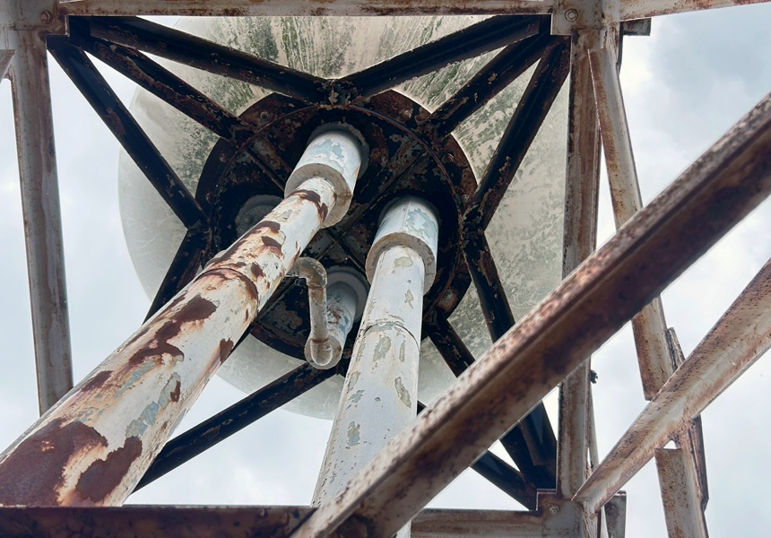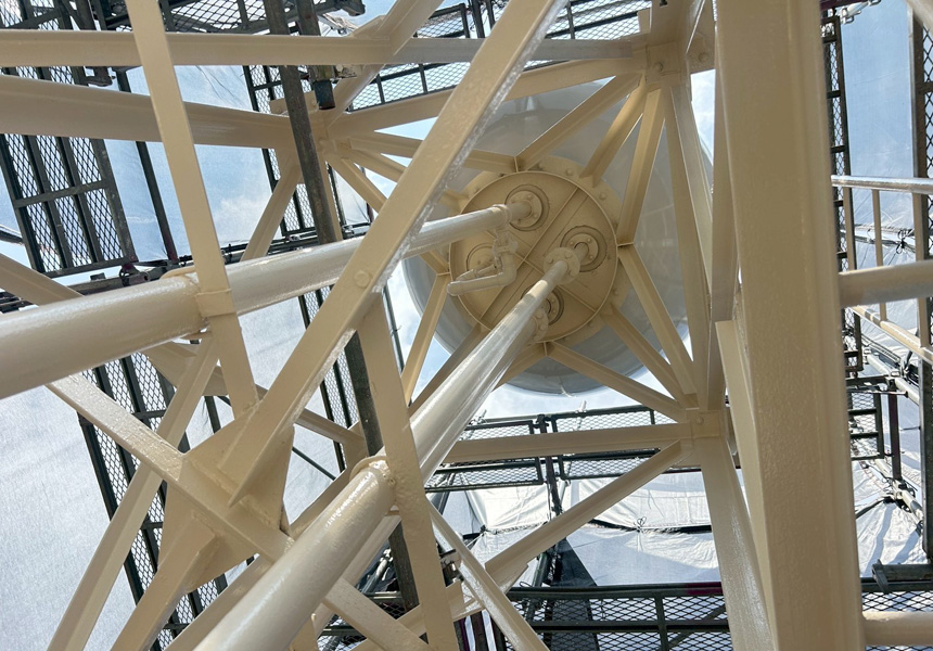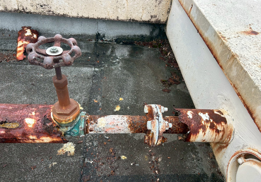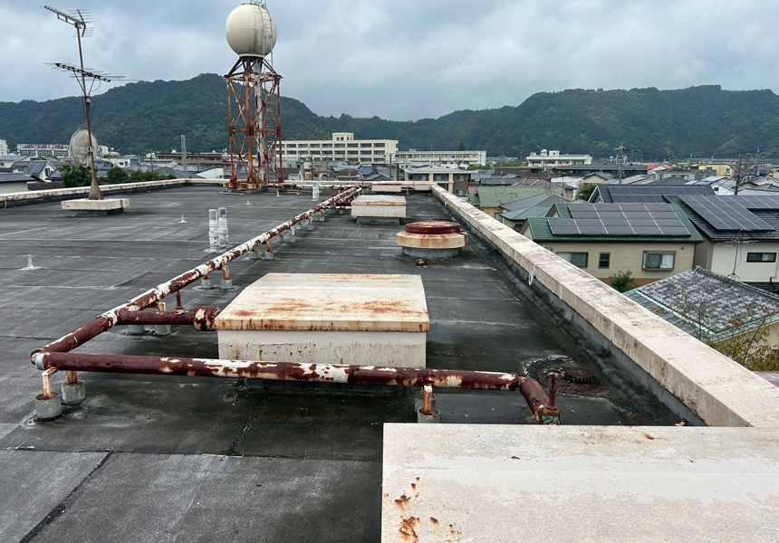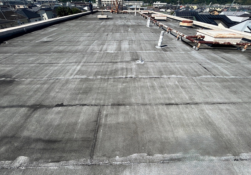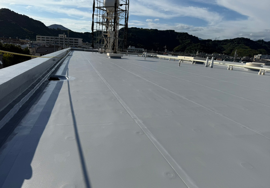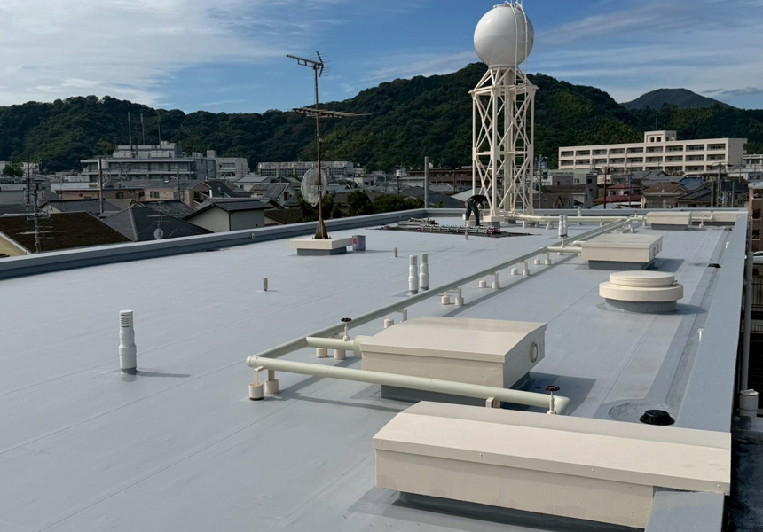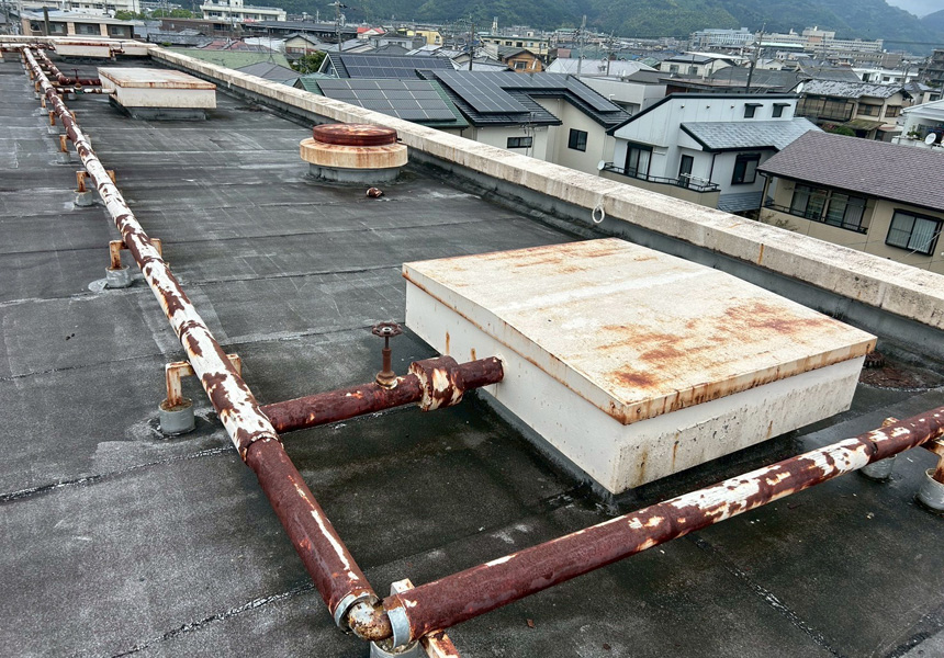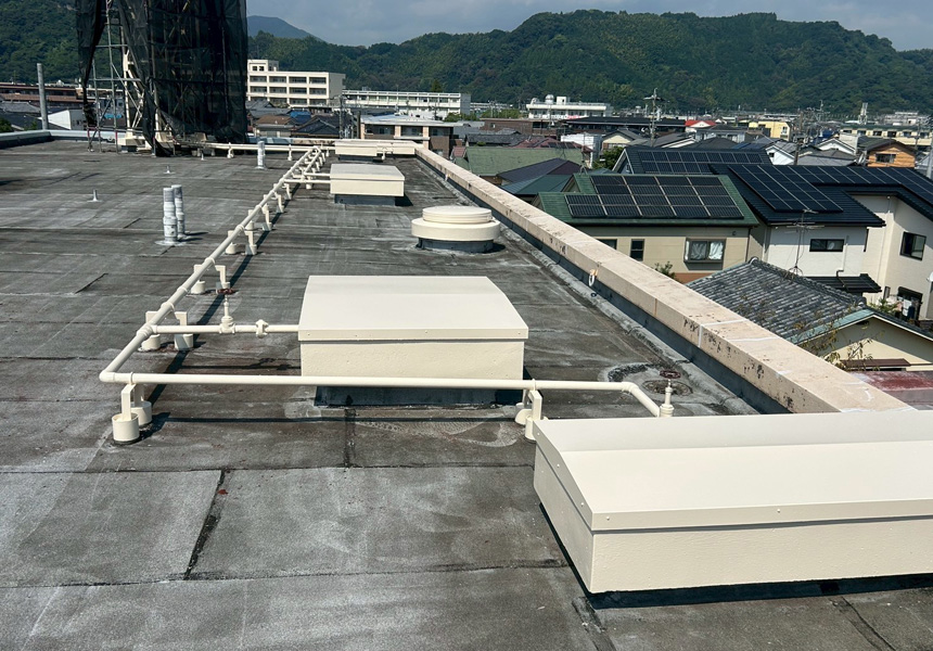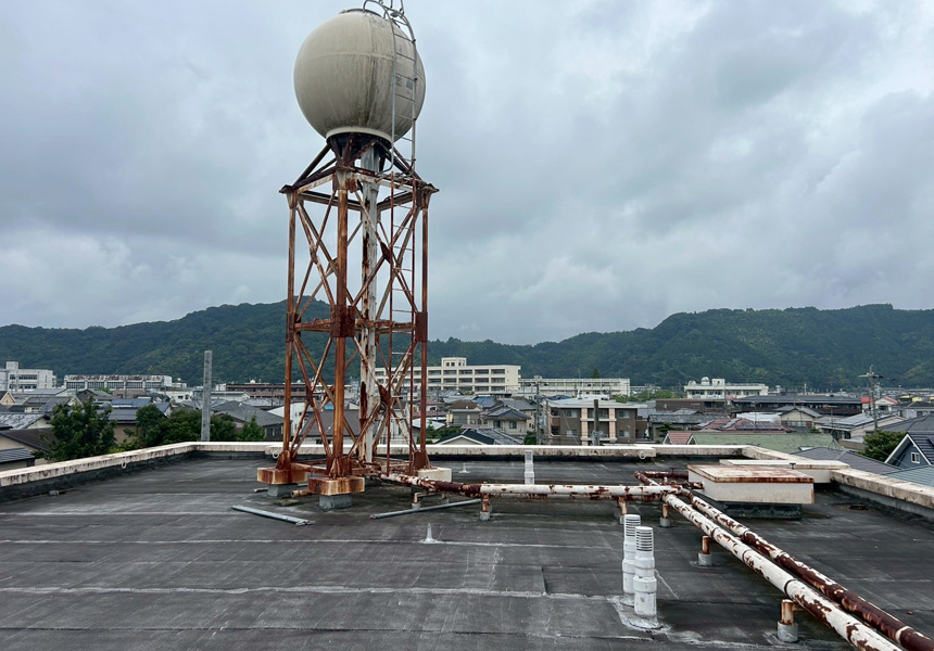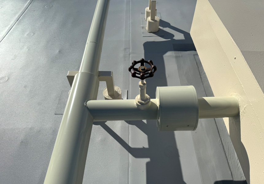 屋上は、アスファルト防水から塩ビシート機械式固定工法で施工し、高架水槽・架台塗装、また給水配管の保温カバー交換工事も一緒に施工させていただきました。